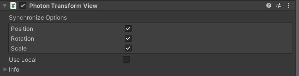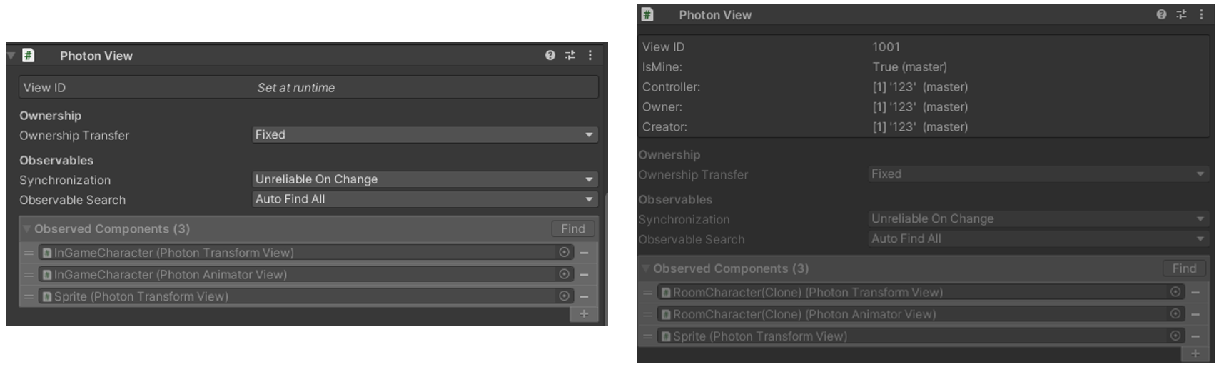 속성 설명 View ID 오브젝트를 고유하게 식별하는 ID IsMine 해당 오브젝트가 로컬 플레이어 소유인지에 대한 여부 Owner 현재 오브젝트를 소유한 플레이어 Creator 오브젝트를 생성한 플레이어 Observable Components 동기화할 컴포넌트 목록 (Transform, Animator 등)