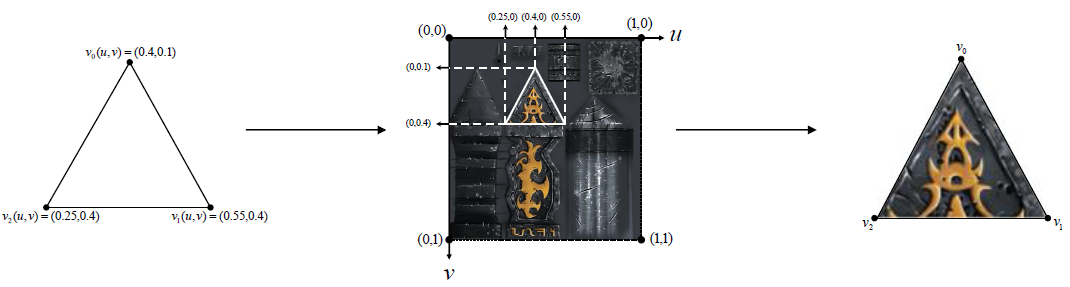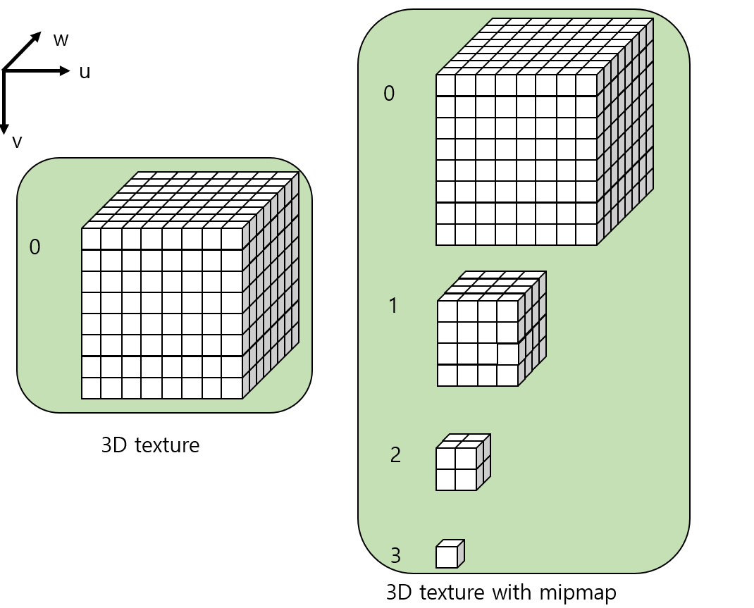 - UVW coordinate : mapping the sizes of the texture in the $X$, $Y$, and $Z$ in the ranges of $[0, 1]$ of $U$, $V$, and $W$