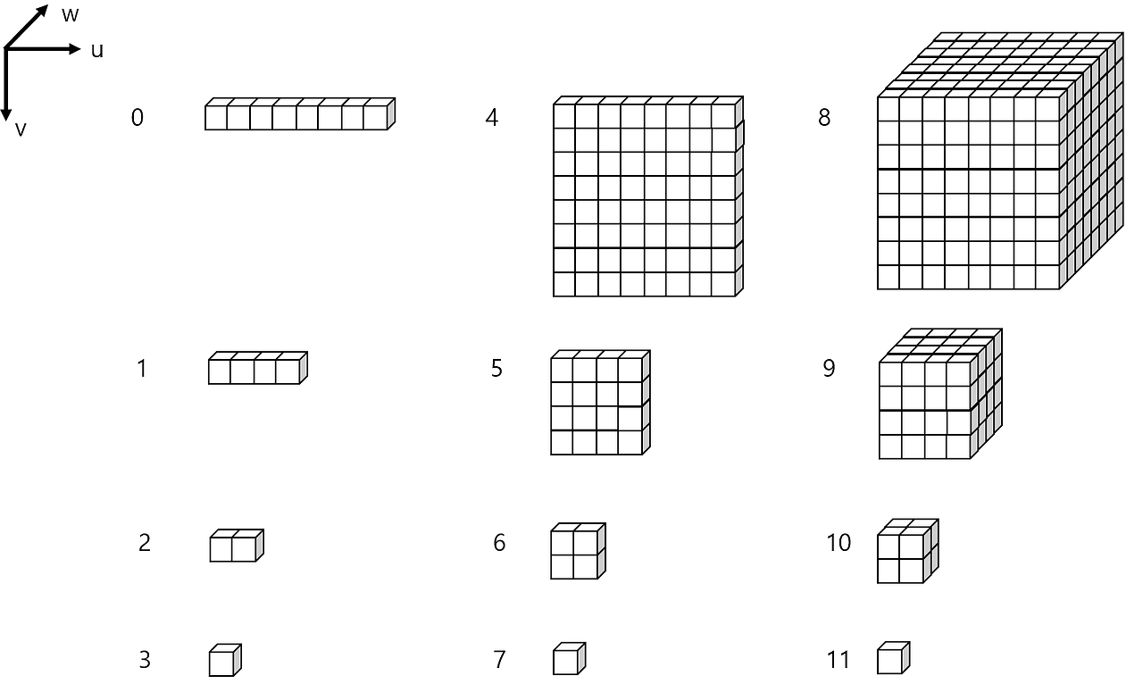 Example of the 2D texture // Shader resource view struct D3D11_TEX2D_SRV { UINT MostDetailedMip; UINT MipLevels; } struct D3D11_TEX2D_ARRAY_SRV { UINT MostDetailedMip; UINT MipLevels; UINT FirstArraySlice; UINT ArraySize; } struct D3D11_TEX2DMS_SRV { // Since a multisampled 2D texture contains a single subresource, there is actually nothing to specify // UnusedField_NothingToDefine is included so that this structure will compile in C UINT UnusedField_NothingToDefine; } struct D3D11_TEX2DMS_ARRAY_SRV { UINT FirstArraySlice; UINT ArraySize; } struct D3D11_TEXCUBE_SRV { UINT MostDetailedMip; UINT MipLevels; } struct D3D11_TEXCUBE_ARRAY_SRV { UINT MostDetailedMip; UINT MipLevels; // Specify the first texture element to be used UINT First2DArrayFace; // The number of cube maps; must be multiplication of 6 UINT NumCubes; } // Unordered access view struct D3D11_TEX2D_UAV { UINT MipSlice; } struct D3D11_TEX2D_ARRAY_UAV { UINT MipSlice; UINT FirstArraySlice; UINT ArraySize; } // Render target view struct D3D11_TEX2D_RTV { UINT MipSlice; } struct D3D11_TEX2D_ARRAY_RTV { UINT MipSlice; UINT FirstArraySlice; UINT ArraySize; } struct D3D11_TEX2DMS_RTV { UINT UnusedField_NothingToDefine; } struct D3D11_TEX2DMS_ARRAY_RTV { UINT FirstArraySlice; UINT ArraySize; } // Depth stencil view struct D3D11_TEX2D_DSV { UINT MipSlice; } struct D3D11_TEX2D_ARRAY_DSV { UINT MipSlice; UINT FirstArraySlice; UINT ArraySize; }- 3D texture