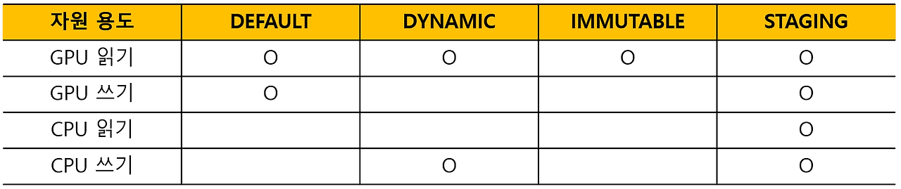 - Ex. static constant, vertex buffer, index buffer, ...