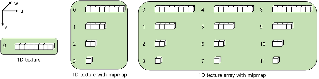 Example of the 1D texture // Shader resource view struct D3D11_TEX1D_SRV { // The level of mip-map at the beginning of the mip-map range UINT MostDetailedMip; // The number of mip-map levels UINT MipLevels; } struct D3D11_TEX1D_ARRAY_SRV { UINT MostDetailedMip; UINT MipLevels; // The first slice of the texture slice range to be included in the resource view UINT FirstArraySlice; // The number of slices UINT ArraySize; } // Unordered access view : provide one single level of mip-map to the pipeline struct D3D11_TEX1D_UAV { // A level of mip-map to be provided to the pipeline UINT MipSlice; } struct D3D11_TEX1D_ARRAY_UAV { UINT MipSlice; UINT FirstArraySlice; UINT ArraySize; } // Render target view struct D3D11_TEX1D_RTV { UINT MipSlice; } struct D3D11_TEX1D_ARRAY_RTV { UINT MipSlice; UINT FirstArraySlice; UINT ArraySize; } // Depth stencil view struct D3D11_TEX1D_DSV { UINT MipSlice; } struct D3D11_TEX1D_ARRAY_DSV { UINT MipSlice; UINT FirstArraySlice; UINT ArraySize; }- 2D texture