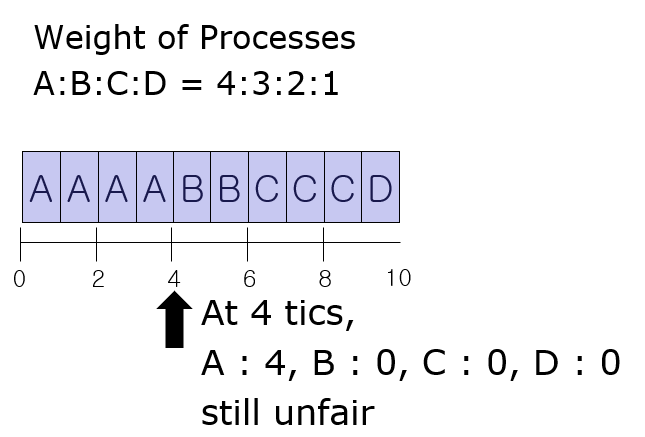 - Virtual Finish Time (VFT) : (virtual time) + 1 / (weight of the process)