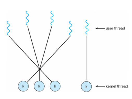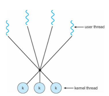 - Multiplexes many user threads to smaller or equal number of kernel threads.