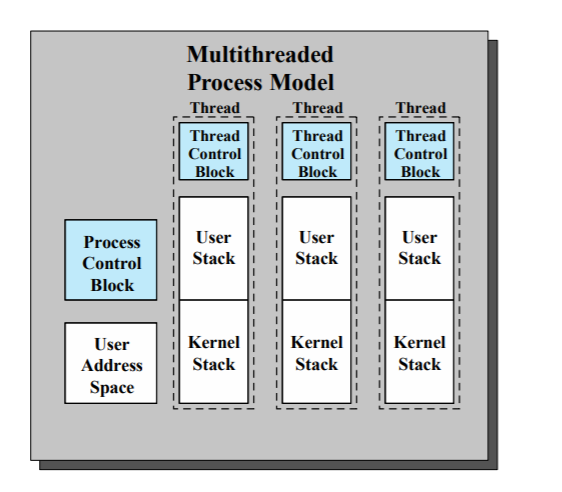 - TCB (Thread Control Block) : Data structure in the operating system kernel which contains thread-specific information needed to manage it.